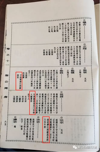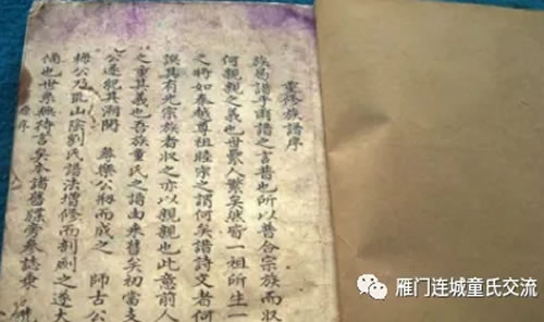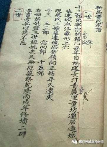 笔者于2017年在网上搜索“连城童氏”时,看到一张“新昌童氏家谱”(如下图),原谱像素很低,仔细看可以分辨清上面的文字,上面明确记载“一世 十三郎宋宁宗开禧 乙丑年自福建长汀青岩里童坊迁居连城,葬连城泡洋象形上穴.....”,这岂不是从笔者家乡连城县迁出的吗?可惜笔者只查阅到图片,并没有联系方式,但是能隐隐约约看到有水印“海纳百川”,还有QQ空间图标跟QQ号,于是笔者继续在QQ中搜索“海纳百川”,还真的找到了,就是浙江江山童海根宗亲的网名,于是便把该张图片发给海根宗亲。交谈中得知,该张谱的确出自他的QQ空间相册,但是因为年代久远,记不起该谱从哪里来了,甚为可惜。