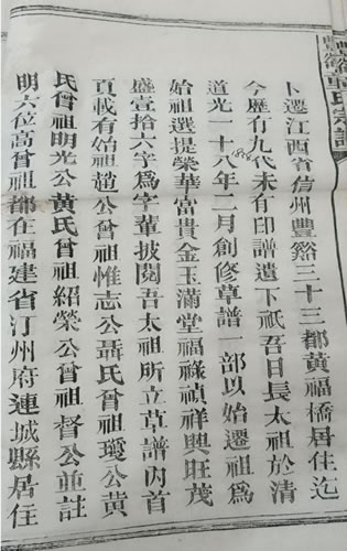 盖木有本水有源,犹如人之有祖宗也。本木固,则枝叶必茂,水源深,而川流必长。犹人之祖宗德厚而子孙必昌,以此验之。凡为子孙者,甚难忘其本儿。然报本追远古圣尚有明训岂今乃尔。夫,人家族世系莫考尊卑,莫分亲疏,莫辨远派支,莫联皆缘,谱之未修也。吾族始迁太祖曰公振暨太祖妣李氏,于康熙年间由福建省汀州府连城县卜迁江西省信州丰溪三十三都黄福桥居住,迄今历有九代,未有印谱遗下袛。吾日长太祖于清道光一十八二月创修草谱一部,以始迁祖为始祖,选提 荣华富贵 金玉满堂 福禄祯祥 兴旺茂盛 壹拾六字为字辈批阅。吾太祖所立草谱内首页载有始祖赵公、曾祖惟志公、聂氏、曾祖瑗公、黄氏、曾祖明光公、黄氏、曾祖绍荣公、曾祖督公,并注明六位高祖都在福建省汀州府连城县居住,未出丰溪。是以不知字辈,不知生终云云。但此六位始曾祖既在福建连城未出丰溪,而吾日长太祖尚比始迁祖更下四代,何知此祖之名?又何知此祖妣之姓氏?究其实在,必是代代口传心记,如系原有字迹遗下其祖生终必载更阅,五位统称曾祖者。谅属一辈又究不出何位太祖是直系之祖,或是旁系之祖。欲考其祥必往连城阅谱,始能奈斯。时未静载事未停兼之路途甚遥,势难定归原籍。按续会修,只得权依日长公所创之草谱加编纲目翻为印谱,或后世有志裔孙欲追原出之始祖,必以公振之名并以六位始曾祖之名到连城请出童氏宗谱核对。如对得此祖之名及配氏某某无差是吾源流之真谱也。若不详记载,则后世难有坚志裔孙追而无门,寻而无路,是为切实叙记。