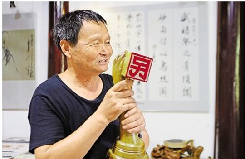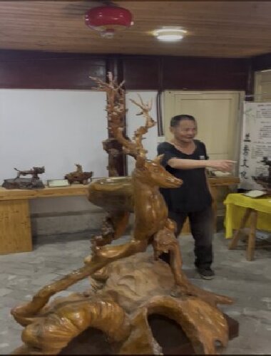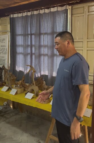 年近八旬的童布端宗亲对祖籍宗亲和衢州江山远道而来的童氏宗亲到访热情接待,认真介绍起他引以自豪的藏品根雕鹿及众多收藏作品,还为我们哼唱起“渔工号子”。