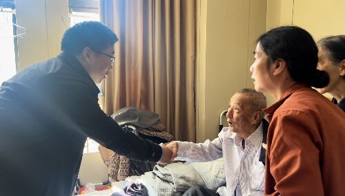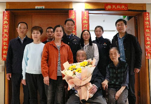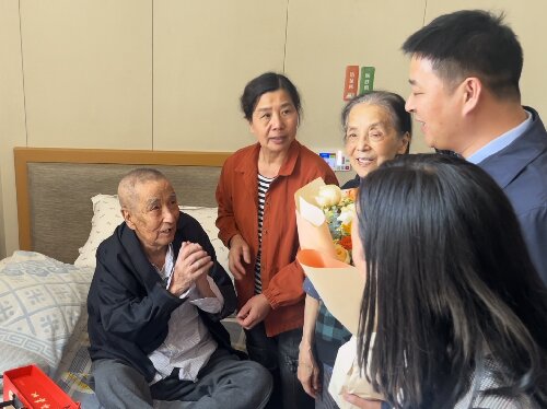 见证了叔侄俩历史性的相见,江西省公安厅同志送上早已准备好的鲜花与水果,对老人与全家表示祝贺。老人虽然腿脚不便,但仍坐在床上抱拳拱手施礼表示感谢。