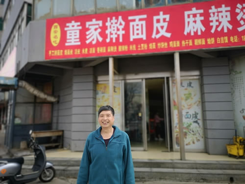 心有不甘,继续追问,还好小伙子闲着,心情也好,不烦我多问。原来的老扳叫什么,有没有联系电话?得到的回答是没有。此时的我,一副无奈。出的门来,又抬起头看了看横幅,"西安名吃"印在一个椭圆里,而红底白字很显眼“童家擀面皮麻辣烫”下面还有一行各种小吃,名字不大,不细看还真不知道是什么。